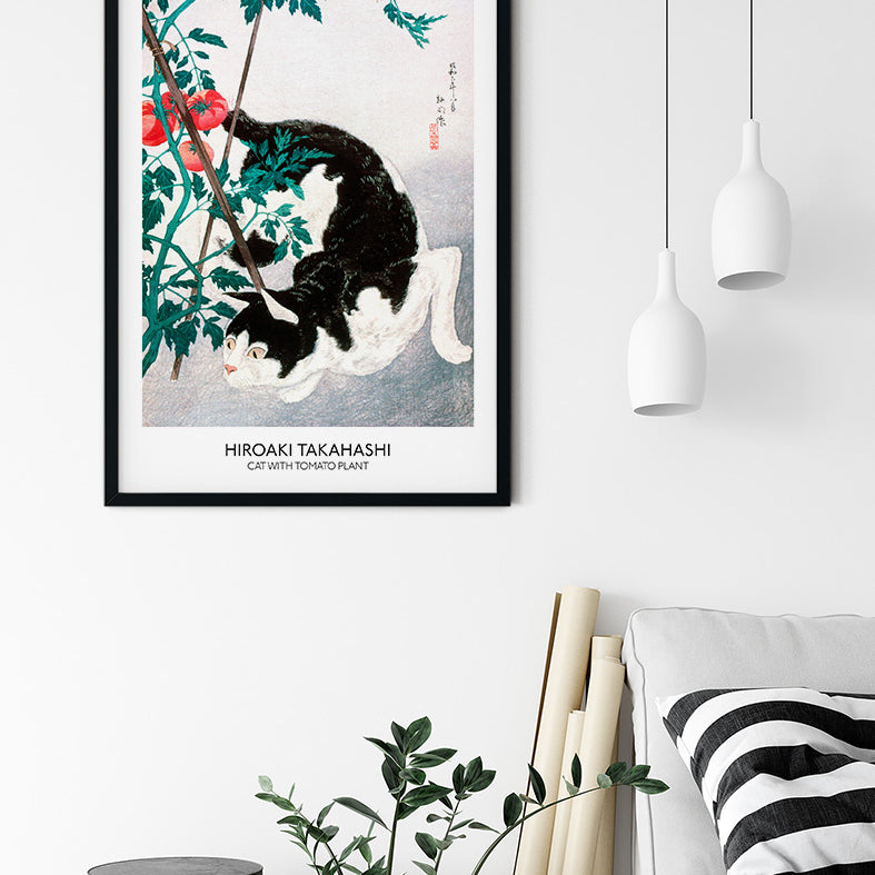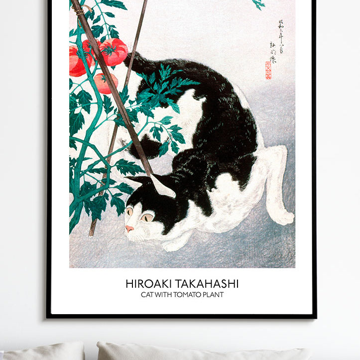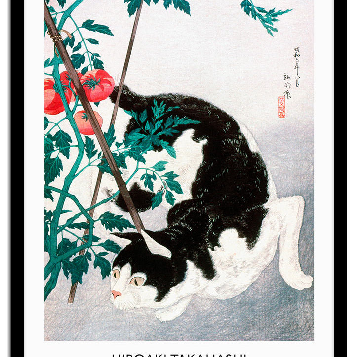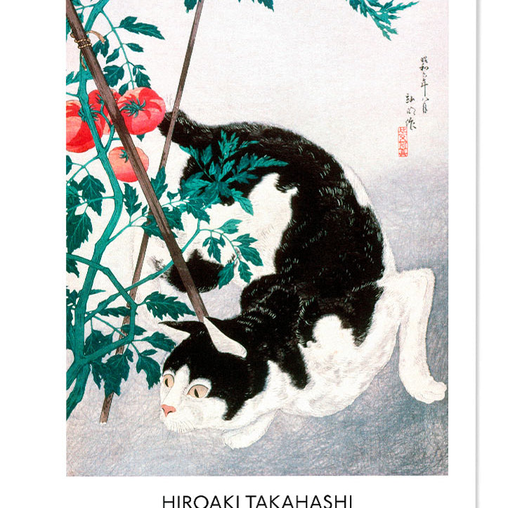 Vintage Japanese art print. Cat with Tomato Plant art poster by Hiroaki Takahashi.