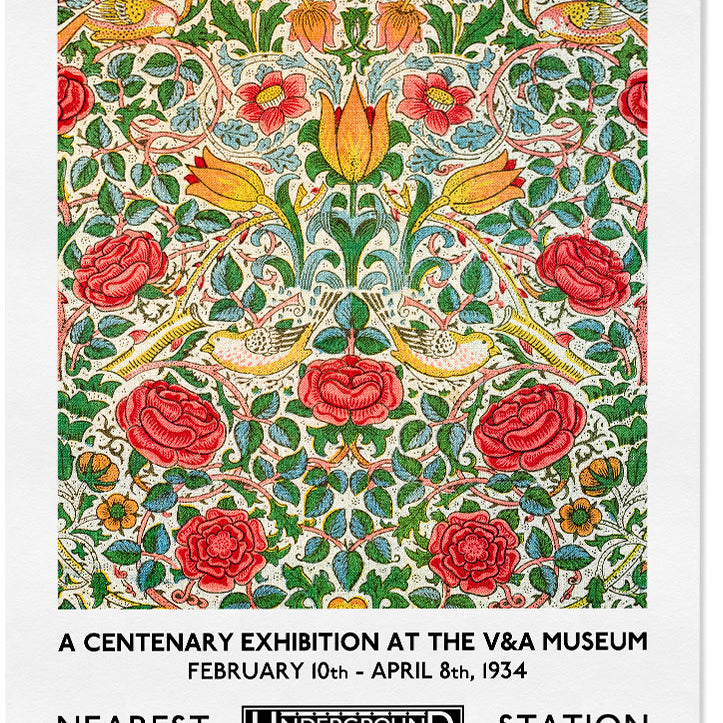 Vintage rose floral art print. A beautiful exhibition poster by William Morris, a classic flower pattern in Arts and Crafts style that will give your home a timeless style. Red, yellow and green coloured floral illustration with the name of the artist on the top and the exhibition details at the bottom.