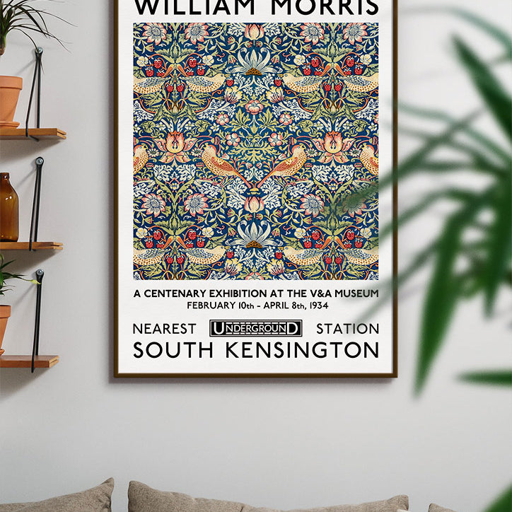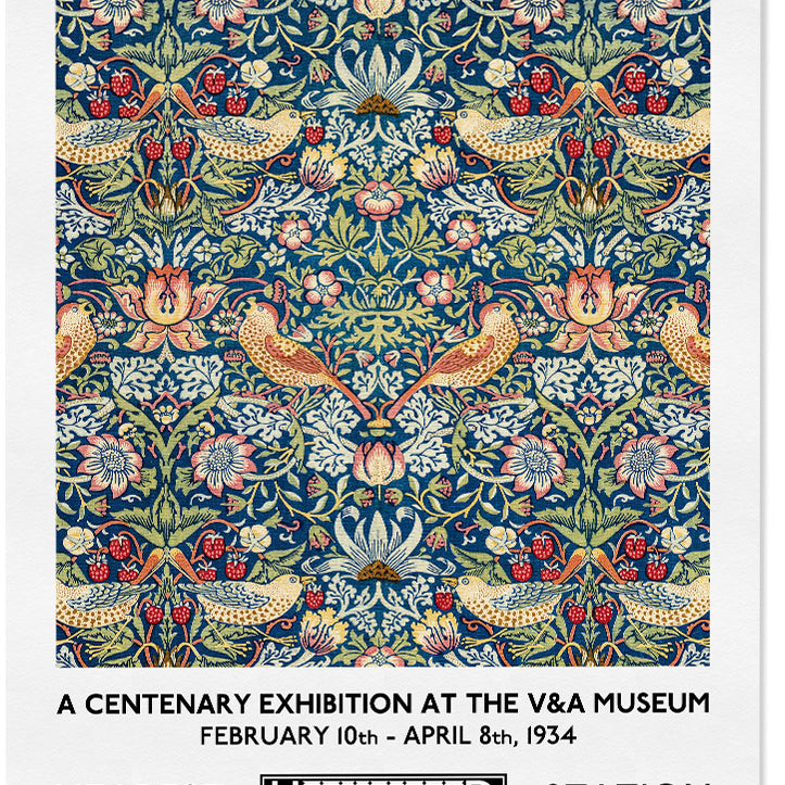 Vintage exhibition poster by William Morris. This classic Strawberry Thief pattern by will give your home a timeless style. Vintage bird illustration with the name of the artist at the top and the exhibition details at the bottom.