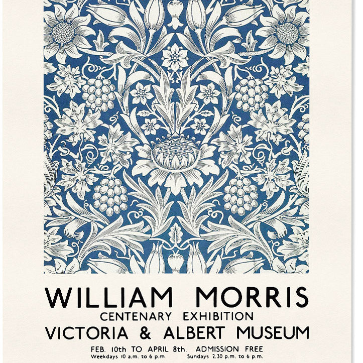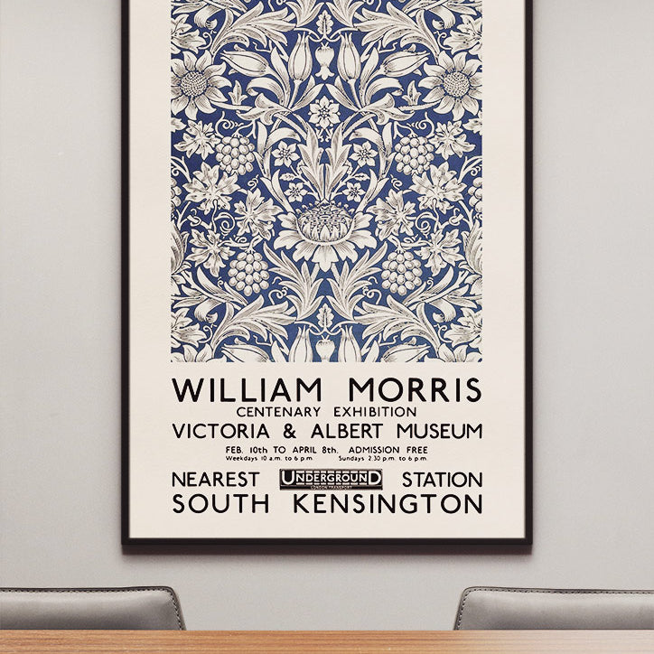 Vintage Sunflower illustration by William Morris. This blue floral exhibition poster will give your home a timeless style.