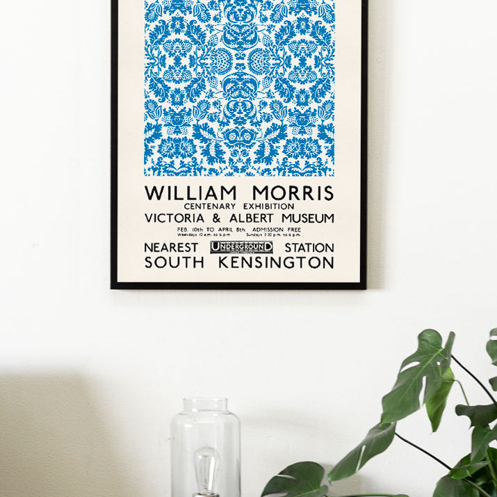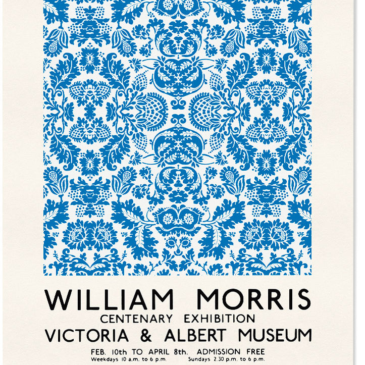 A beautiful exhibition poster by William Morris. Blue Venetian floral pattern.