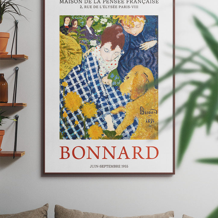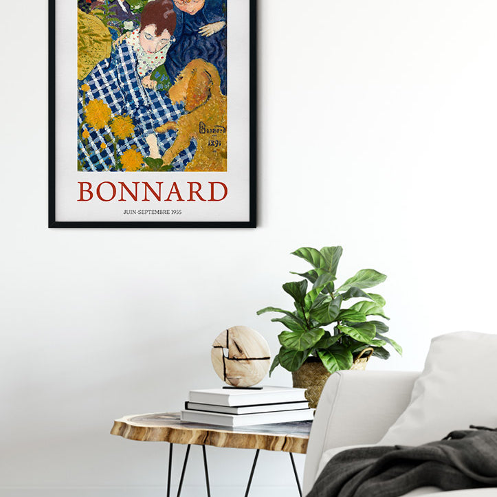 Art exhibition poster by Pierre Bonnard featuring his painting the "Woman with Dog". Pierre Bonnard was a French painter, illustrator and printmaker, known especially for the stylized decorative qualities of his paintings and his bold use of color.