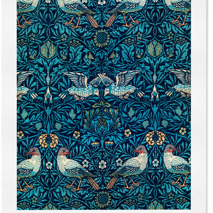 Classic blue bird pattern by William Morris with blue text at the bottom. Reproduction of a beautiful exhibition poster for the centenary exhibition in the Victoria and Albert Museum.