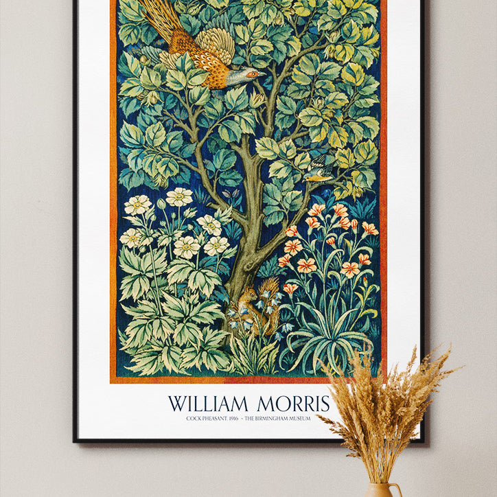 Cock Pheasant is one of the most recognized illusrtations of William Morris. A beautiful vintage bird art print with text at the bottom. This classic pattern by William Morris will give your home a timeless style.