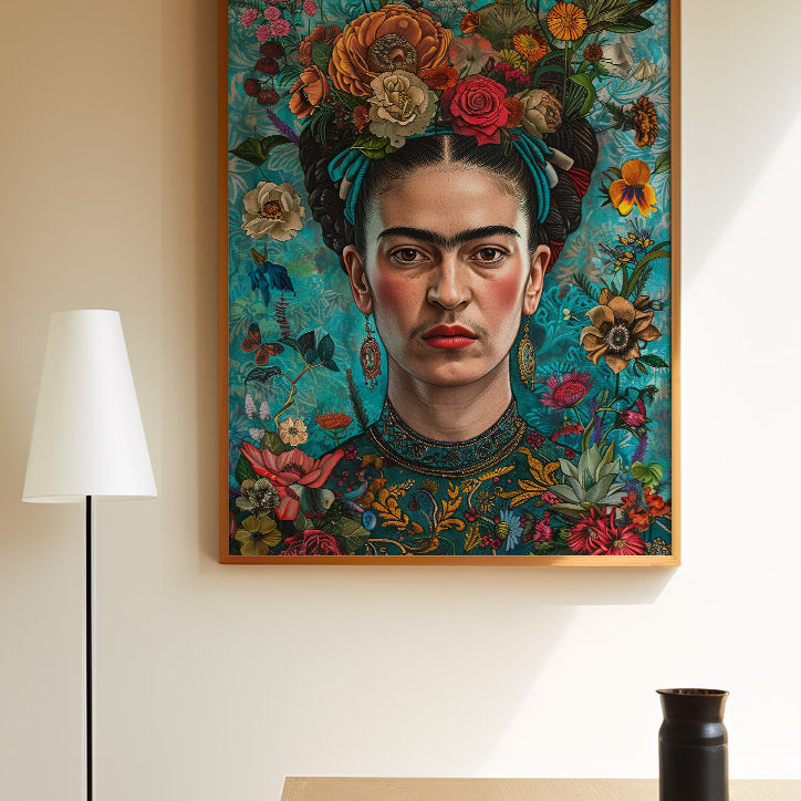 Discover the vivid charm of Frida Kahlo's portrait, adorned with colorful flowers and a rose in her hair. This captivating artwork celebrates femininity and nature, ideal for enriching your art collection.
