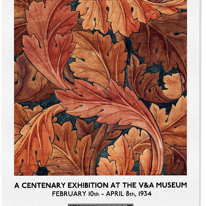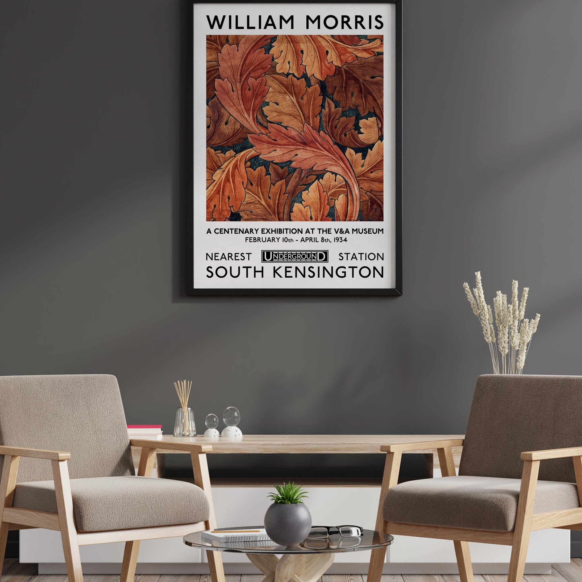 Exhibition art poster by the famous artist William Morris in brown and black. This William Morris print will never go out of style and is a great choice of art to put on your walls.