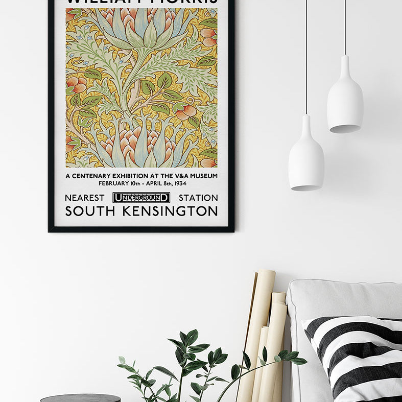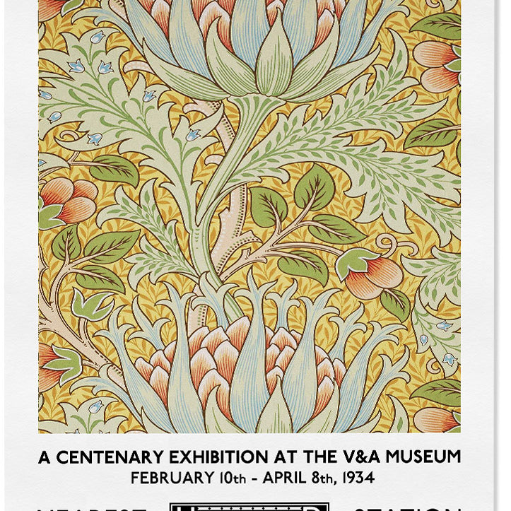 Reproduction of a vintage William Morris exhibition poster held in 1934 in the Victoria and Albert Museum. The original floral artwork is called 'Artichoke'.