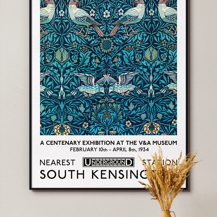 A beautiful exhibition poster by William Morris with the artist's name on the top. Vintage bird illustration. This classic pattern will give your home a timeless style.