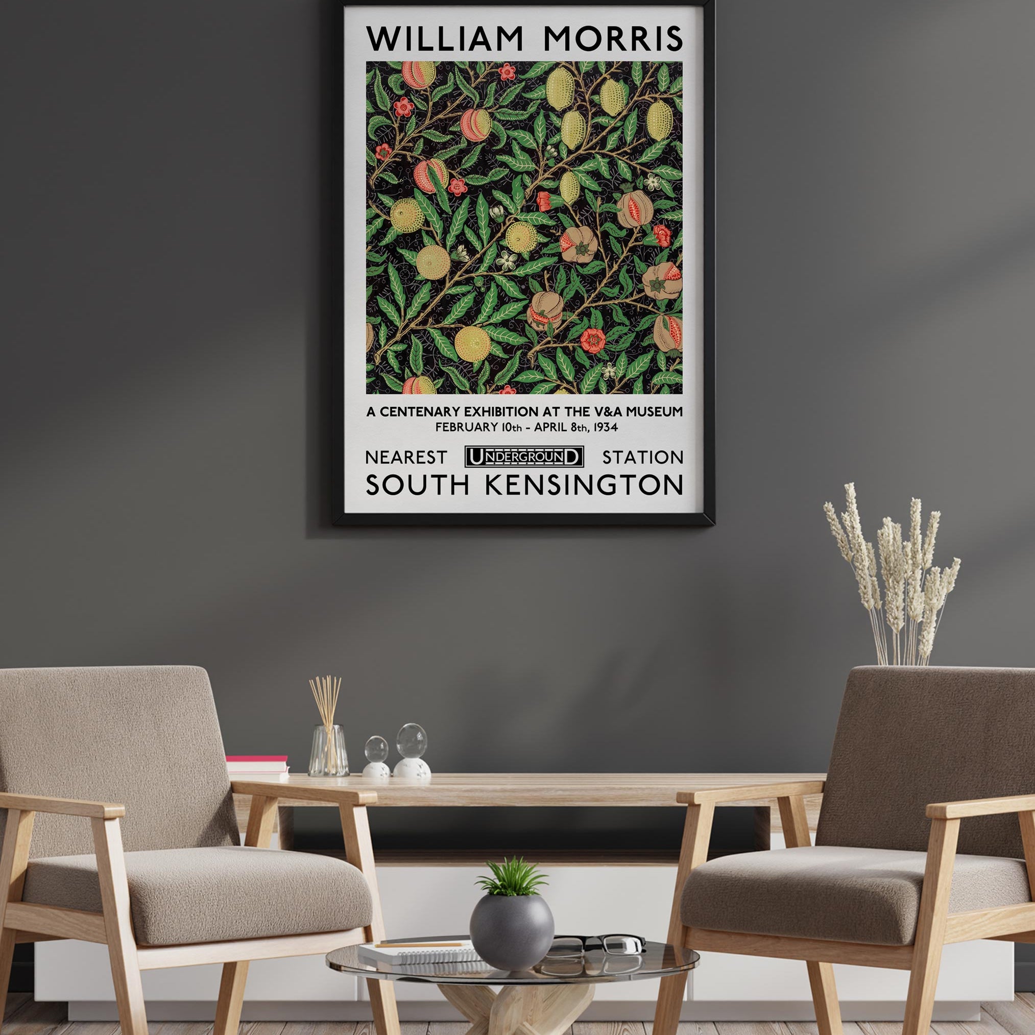 William Morris exhibition poster featuring his colourful citrus fruit illustration.