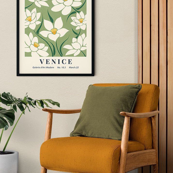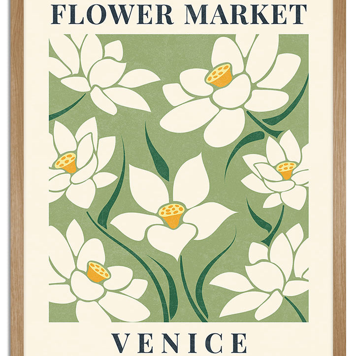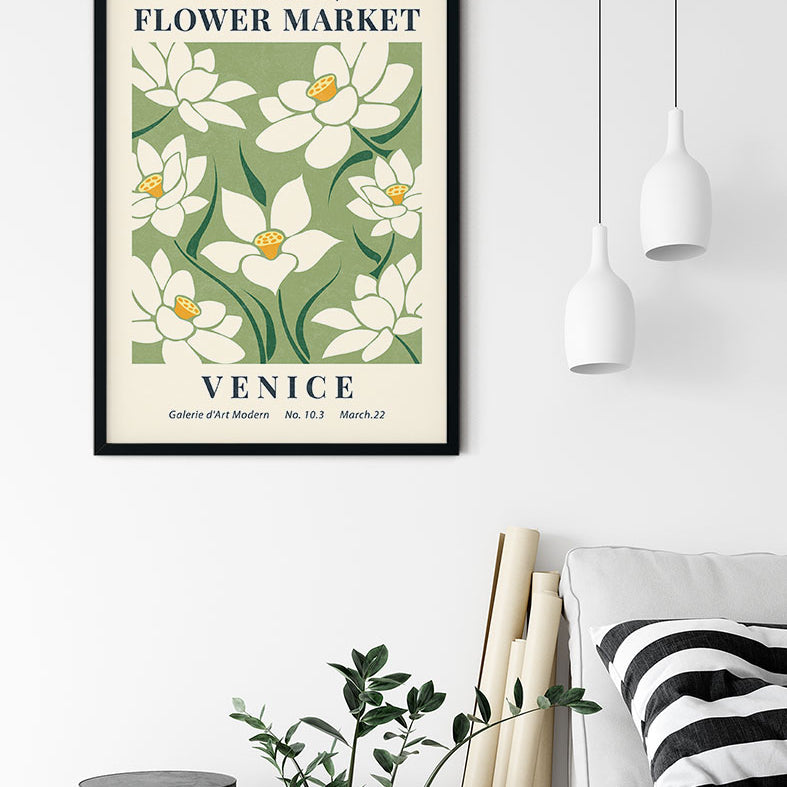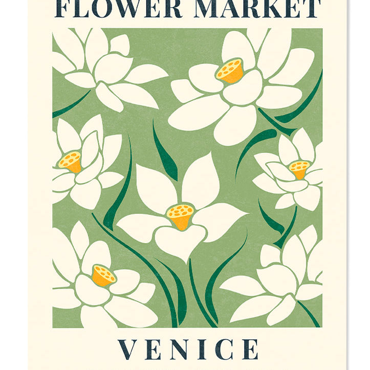 This Venice Flower Market Poster is a beautiful wall art to brighten your home. Green, white and yellow colours, with text at the top and bottom. Printed on to 200gsm matte paper. See the full Flower Market Collection here >
