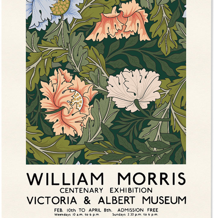 A beautiful green floral exhibition poster by William Morris. William Morris (1834–1896) was a British textile designer, poet, novelist and socialist activist associated with the Arts and Crafts Movement.