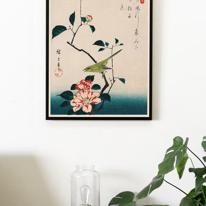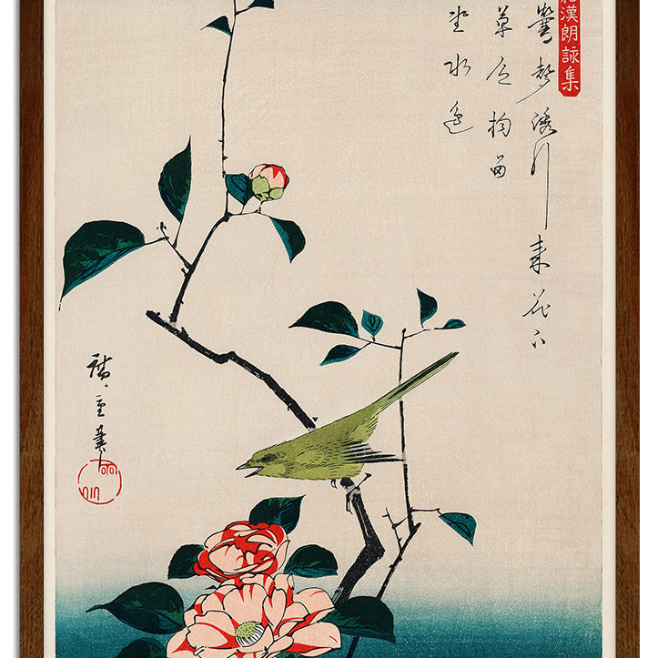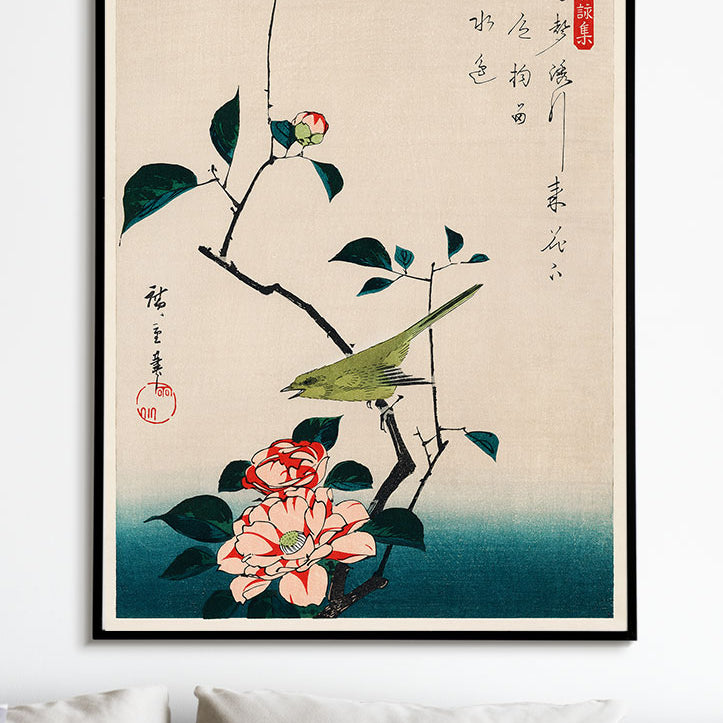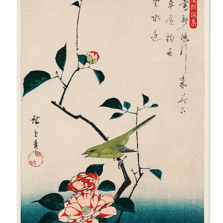 Utagawa Hiroshige art print Camellia and Nightingale, c. 1840.
