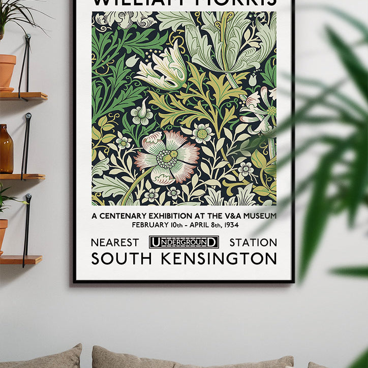 A beautiful exhibition poster by William Morris featuring one of the most recognized Arts and Crafts floral design.