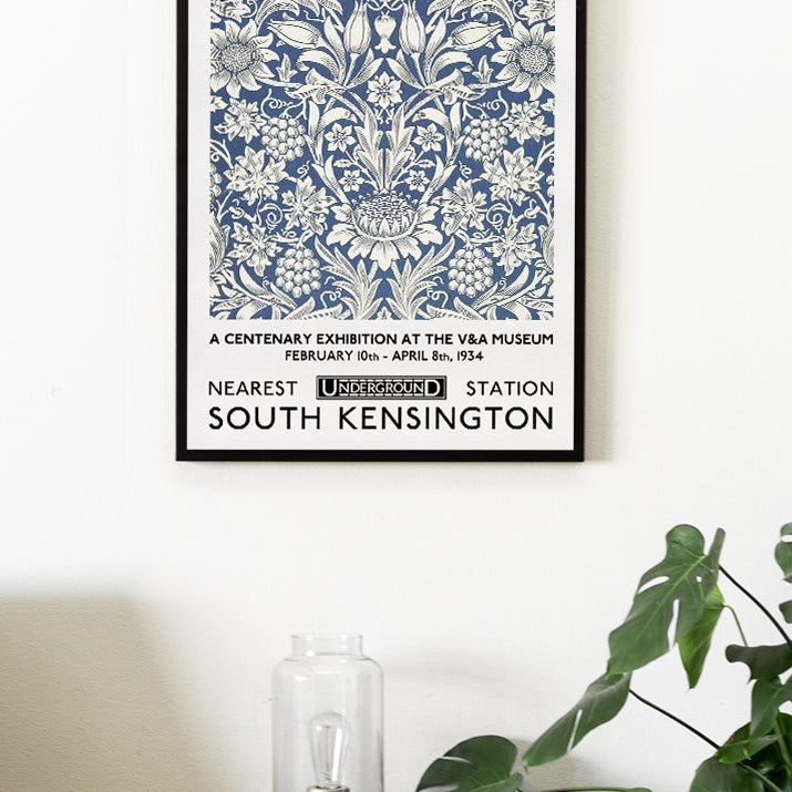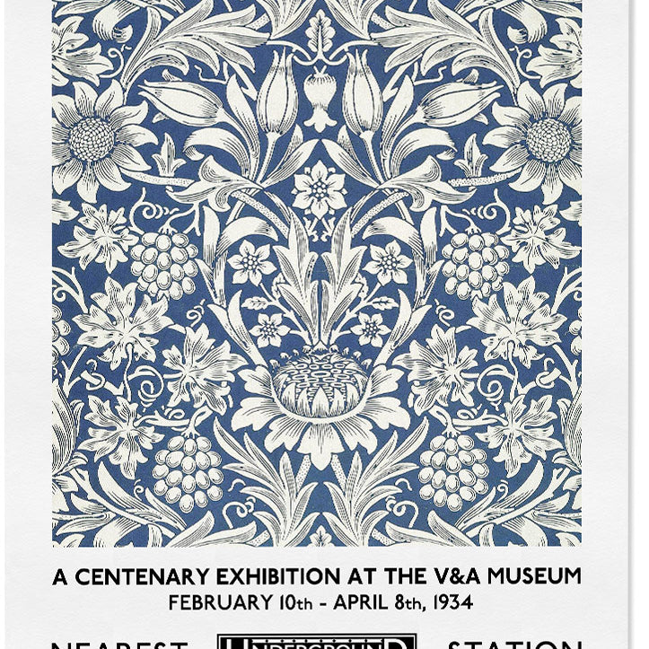 'Sunflower'. A beautiful exhibition poster by William Morris. This classic blue flower pattern by William Morris will give your home a timeless style. Vintage floral illustration with the name of the artist at the top and the exhibition details at the bottom.