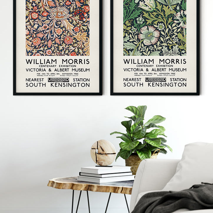 A pair of William Morris prints featuring his famous floral motifs, Compton and Trent. High quality reproductions of two vintage William Morris exhibition posters.