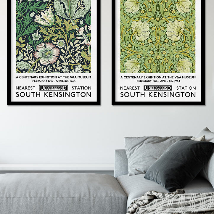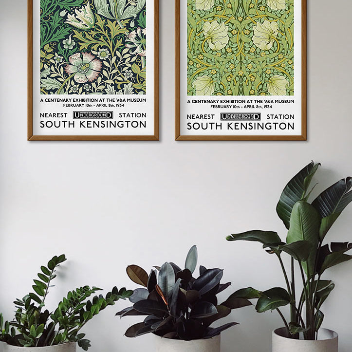 A set of two exhibition posters by William Morris.  Compton and Pimpernel floral paintings. This set of classic flower patterns by William Morris will give your home a timeless style.