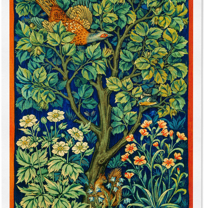 A beautiful illustration by William Morris with green leaves, flowers and a bird. This William Morris inspired art print can be a perfect decoration for your home.