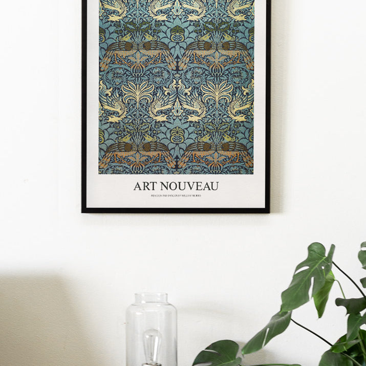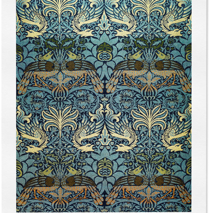 Peacock and Dragon art print by William Morris with text at the top and bottom. Inspired by the Arts and Crafts Movement.